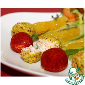 Из сырно-крабовой массы сформировать шарики размером с орех по 5 штук на каждую порцию. Три из них обвалять в молотых фисташках. |