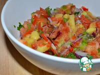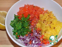 Как и положено, сначала делаем соус, чтобы он успел хорошо настояться и охладиться. Для этого мелко рубим мякоть манго, помидор, красный лук, зелень петрушки, перчик чили по вкусу. |