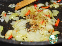 Теперь переходим к непосредственному приготовлению начинки. репчатый лук, чеснок и перчик чили порезать и обжарить с кумином на оливковом масле. |