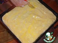 | 1 слой ачмы: раскатать тесто так, чтобы оно немного свешивалось через края формы (на 1-2 см). Этот первый слой не варится. Равномерно распределить тесто по всей форме. Тесто обильно смазать маслом. |