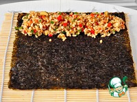 На циновку положить лист нори, шершавой сторой вверх, на край выложить немного начинки |