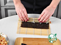 Скрутить, как обычный ролл, не забыв в конце края нори смазать немного водой, чтобы они склеились хорошо. |