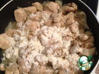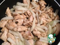 В сковороду налить растительное масло, выложить кусочки курицы, поперчить и посолить, обжаривать около 5 минут, периодически помешивая. |