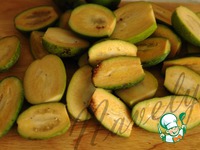 У фейхоа отрезаем чашелистики и разрезаем пополам. Я пропускаю его через мясорубку, можно измельчить в блендере. |