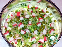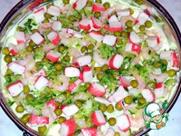 На сыр разложить горошек, тёртый огурец, креветки и нарезанные крабовые палочки. |