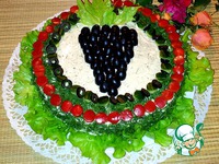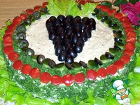 По середине из оливок выложить виноградную гроздь. Из салатных листьев вырезать листочки похожие на виноградные. |