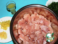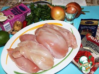 Куриное филе промываю, промокаю салфеткой и нарезаю небольшими кусочками. Чеснок и имбирь (предварительно почищенные) тру на мелкой терке, из лайма выдавливаю сок. |