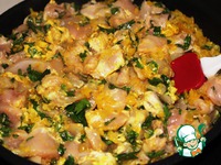 Добавляю к луку курицу вместе с маринадом и жарю, помешивая, пока кусочки мяса не потеряют розовый цвет. |