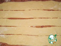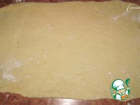 Рабочую поверхность присыпать мукой. Тесто раскатать в прямоугольник. Толщина теста примерно-2-3 мм. |