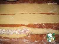 Описание: Пирог "Улитка". Мягкое, воздушное тесто в сочетании с солоноватой начинкой из брынзы, сочных крабовых палочек и ароматного укропа.