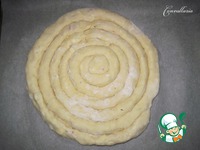 На противень, застеленный бумагой для выпечки, переложить получившиеся "колбаски" и свернуть в "улитку", начиная с центра. |