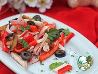 Все соединить (пару ломтиков грибов оставить для украшения), посолить (если нужно), поперчить, полить лимонным соком (я добавила 1 ч. л.) и заправить оливковым маслом. Аккуратно перемешать. |