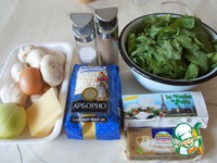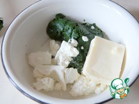 Брынзу размять, смешать с плавленным сыром. Поделить массу на 2 части. Одну часть добавить в шпинатную массу и после этого пробить ее блендером. |