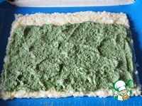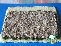 Вынуть противень из духовки и сдвинуть испеченный корж на полотенце, застеленное пищевой пленкой. Выложить сверху грибную массу. |