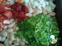 Фасоль выкладываем в противень, добавляем 1 стакан жидкости, в которой варилась фасоль. |