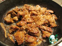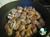 Нарезанную печень основательно присыпаем мукой и перемешиваем так, чтобы равномерно покрыть мукой каждый кусочек. На сковороде разогреваем растительное масло и выкладываем жарить печень. |