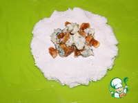 Все действия по сборке лучше производить на пищевой пленке. Разделить сырную массу на 3 части. Сделать из каждой лепешку и поместить внутрь 1/3 часть начинки. |
