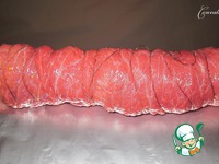 Завернуть рулет в фольгу. Запекать в предварительно разогретой до 200 градусов духовке примерно 1 час. Перед подачей необходимо удалить нитки и мясной рулет нарезать на порционные куски. |