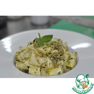 Нарезать тесто на широкие папарделле. Отварить полторы минуты в большом кол-ве воды. |