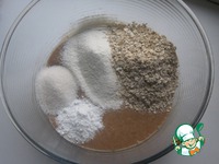 Добавляем просеянную муку, сахар, ванильный сахар, разрыхлитель и овсяные хлопья. Перемешиваем до однородности. |
