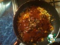 Затем добавляем грибы и томатный соус к луку с морковкой. |