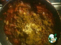 Добавляем приправы и специи, выдавливаем чеснок через пресс, перемешиваем и тушим под крышкой 5 мин. |