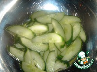 Огурец разрезать вдоль пополам, а затем каждую половинку нашинковать тонкими пластинками по диагонали. Не режьте огурец слишком мелко, его должно быть видно в салате. |