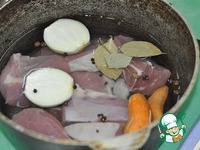 Залить водой, добавить лук, морковь, лавровый лист, перец горошком. Отварить до мягкости тушенки |