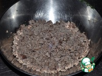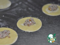 Круги смазываем яйцом, это послужит для того, чтобы они слиплись, в центр кладем начинку. |