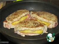 Сделать сбоку каждого куска мяса прорезь, чтобы получился карман, натереть солью и перцем. Вложить по половине колечка ананаса. |