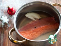 Отварить кусочек свежей рыбы (у меня форель) в воде с добавлением 2 горошин душистого перца, лука и лаврового листа в течение 10-15 минут, до полной готовности. Дать рыбе остыть в этом бульоне. |