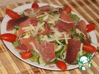Ломтики пршута разорвать на полоски или кусочки и выложить на салат. |