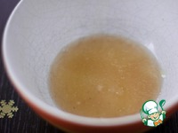 Отжимаем пластины желатина и кладем их в теплый сок от рыбы, если сока маловато, можно добавить ложку бульона, оставшегося от креветок. Перемешивая, ждем, чтобы желатин полностью распустился. |
