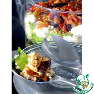 Рукколу выложить в салатник. Поверх выложить булгур и баклажаны с соусом. |