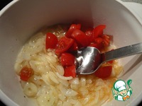 Лук и чеснок мелко нарезать и обжарить на растительном масле. Помидоры нарезать маленькими кусочками и добавить к луку. |
