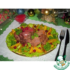 Плоское широкое блюдо выстелить листьями салата, выложить готовый язык, нарезанный ломтиками. Полить подливом. Украсить петрушкой и клюквой. На гарнир можно подать запеченные картофельные дольки. |