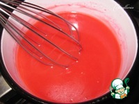 Кастрюлю поставить на огонь, снова довести до кипения, добавить крахмал и сахар, разведенные в 50 мл воды. Постоянно перемешивая венчиком, довести до кипения. |