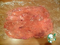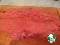 Выкладываем его на пищевую пленку, сверху ею же закрывая, и отбиваем аккуратно рыбку в ровный пласт, посыпаем солью и перцем. |