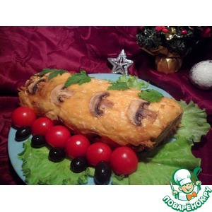 Описание: Предлагаю украсить ваш новогодний стол рыбным рулетом из 2 видов рыбы, фаршированный грибным омлетом с зеленью и покрытый сырной корочкой, украшенной грибами. Рулет можно горячим подавать на стол, а если остынет, то это полноценная холодная закуска-рулет.