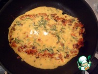 Обжариваем мелко нарезанные лук, морковь, грибы. Смешиваем 2 яйца, 100 мл молока, 2 ст. л. майонеза с зеленью укропа. Выливаем на овощи и доводим омлет до готовности. |