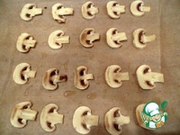 Берем кусок бумаги для выпечки, сбрызгиваем ее растительным маслом, выкладываем слайсы из шампиньонов. |