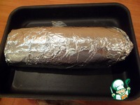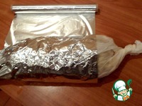 Кладем на сыр наш рыбный рулет, освободив от пленки, аккуратно подворачиваем края бумаги, сверху оборачиваем фольгой. |