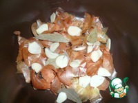 На дно кастрюли положить луковую шелуху, чеснок (порезать пластинками), лавровый лист, перец. |