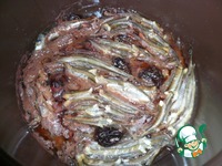 Теперь укладываем плотно друг к другу рыбку (спинками вверх), чтоб она не развалилась при кипении, и чернослив. |