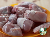Половину тушки курицы нарежьте небольшими кусочками. |