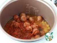 Через 1час 20 минут откройте мультиварку и влейте соус с мясными шариками. Перемешайте, закройте крышку и тушите оставшиеся 10 минут. Готовое блюдо посыпьте нарезанной кинзой. |