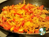 Сладкий перец, лук, чеснок, сельдерей нарезать и обжарить на оливковом масле. |