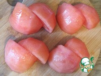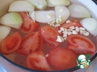 Помидоры, четвертинки лука, чеснок поместить в бульон, проварить около 45 минут. |
