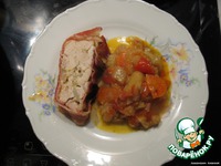 Рулет режим порционно и подаем с тушёными овощами. |