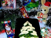 Формы подержать над горячей водой, над паром и перевернуть их в тарелки. Две ёлочки с украшениями и две снежные. |